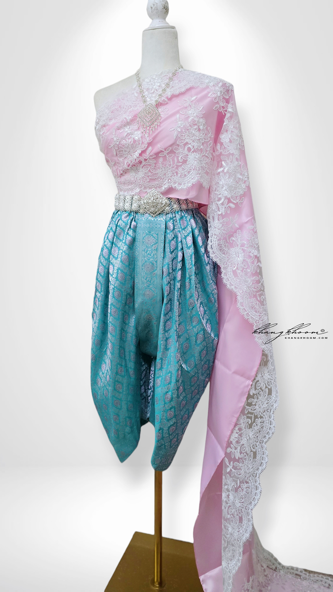 Pants are sewn with an elastic waistband and zipper closure in the front. Sabai are free size and worn wrapped around your chest and over the shoulder