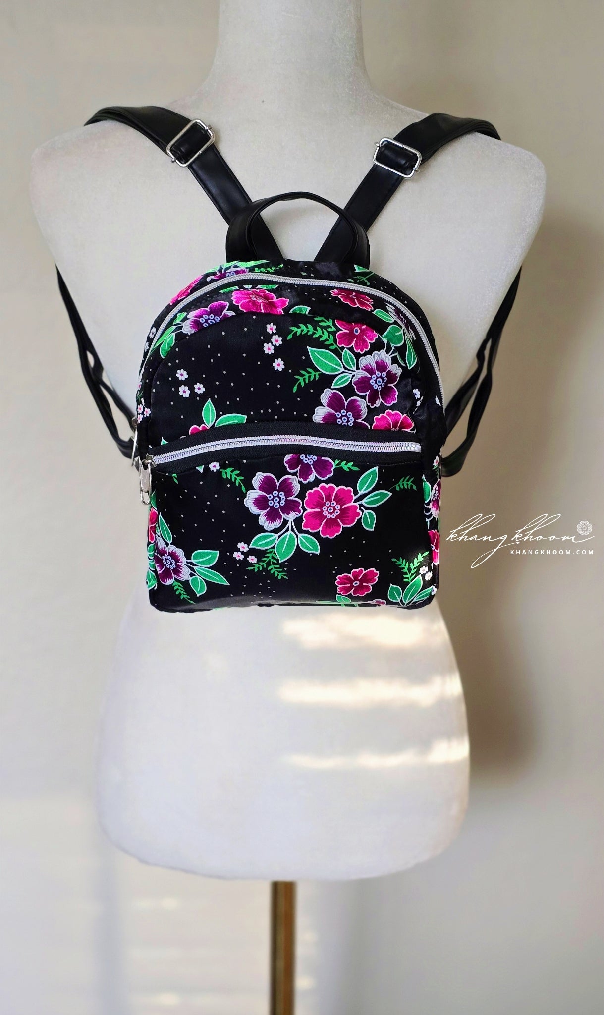 Hmong ntaub li loos featuring 1 interior zipper pocket and 1 interior pocket, 1 frontal zipper pocket and 1 zipper back pocket. Backpack is made with faux leather and floral nylon fabric. Straps are adjustable.