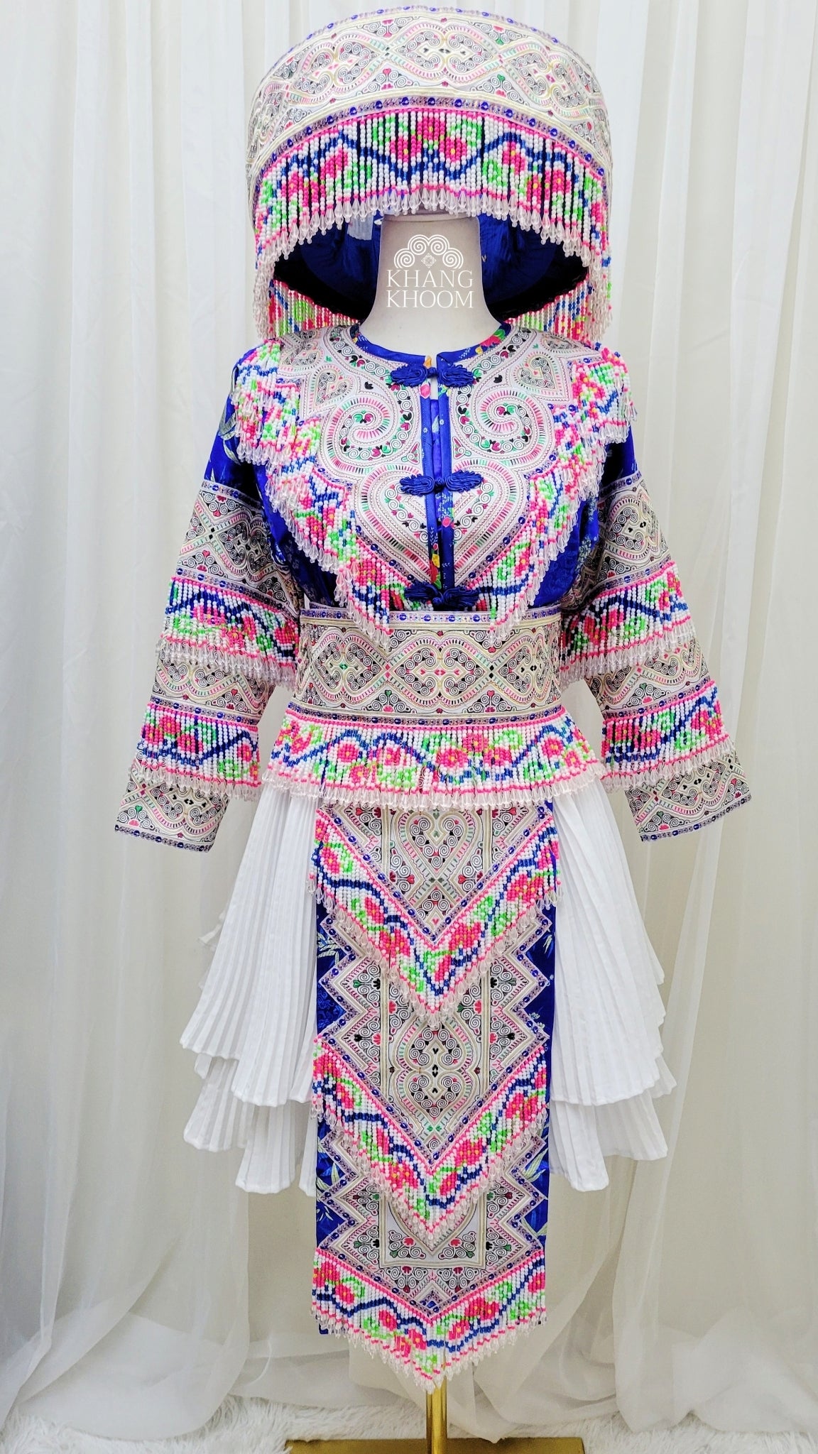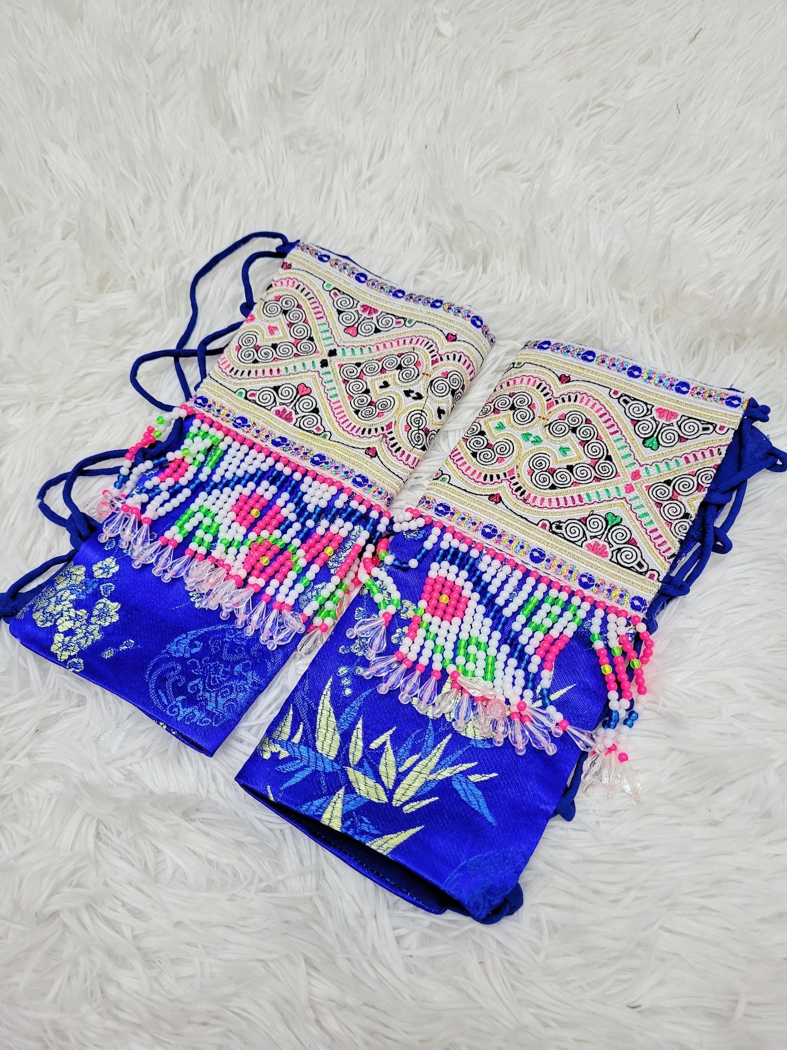 Hmong Suav machine embroidered paj ntaub sewn on brocade fabric. Paj ntaub is not vintage. Fabric is not stretchy.