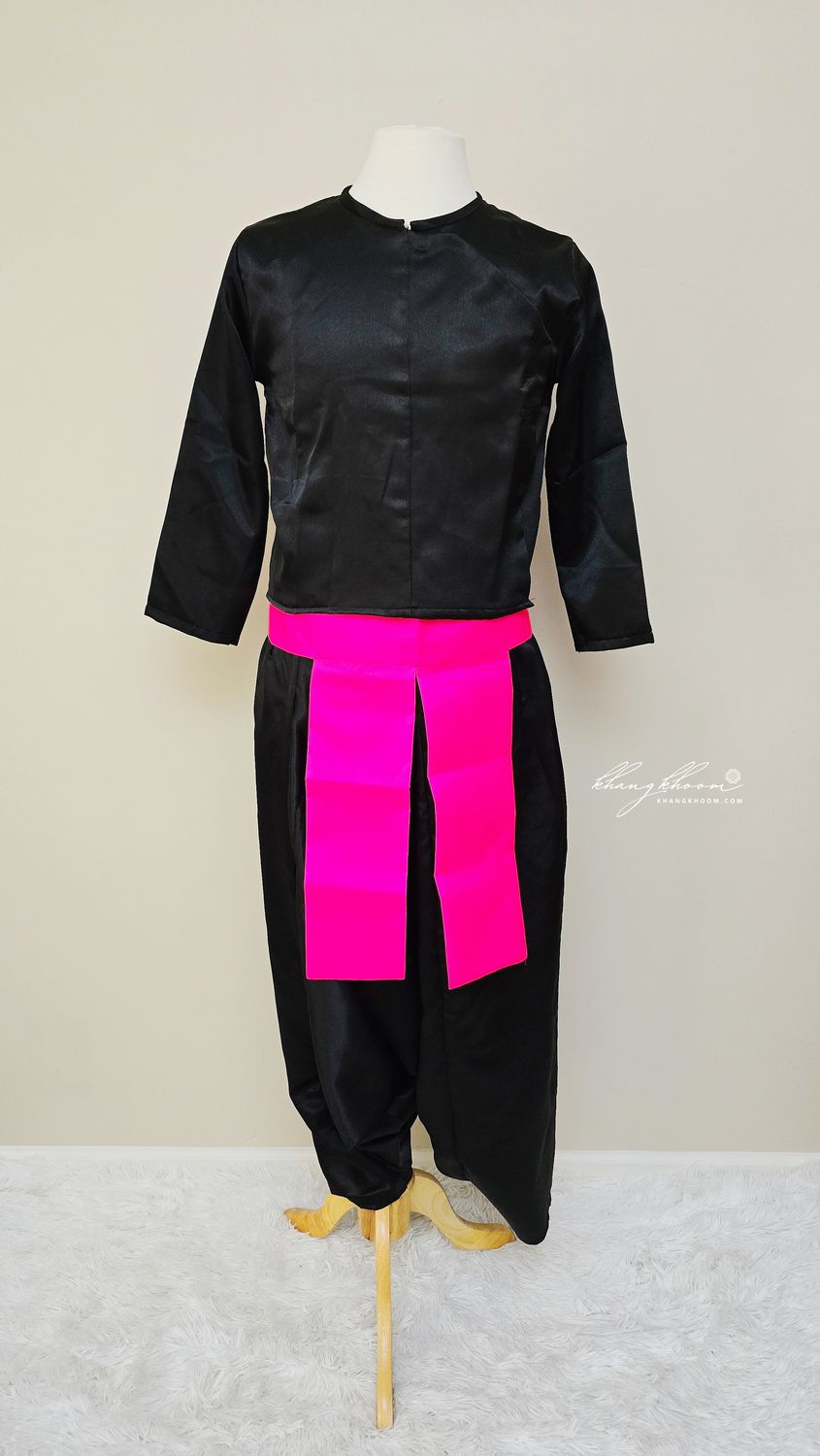 Authentic Hmong Moos Pheeb clothing sewn on a black silky satin fabric (Ntaub Levi) with authentic handmade Moos Pheeb square patch (laug). Pants are sewn with a stretchy waistband in a Hmong Leeg Style where the middle part will hang significantly lower.