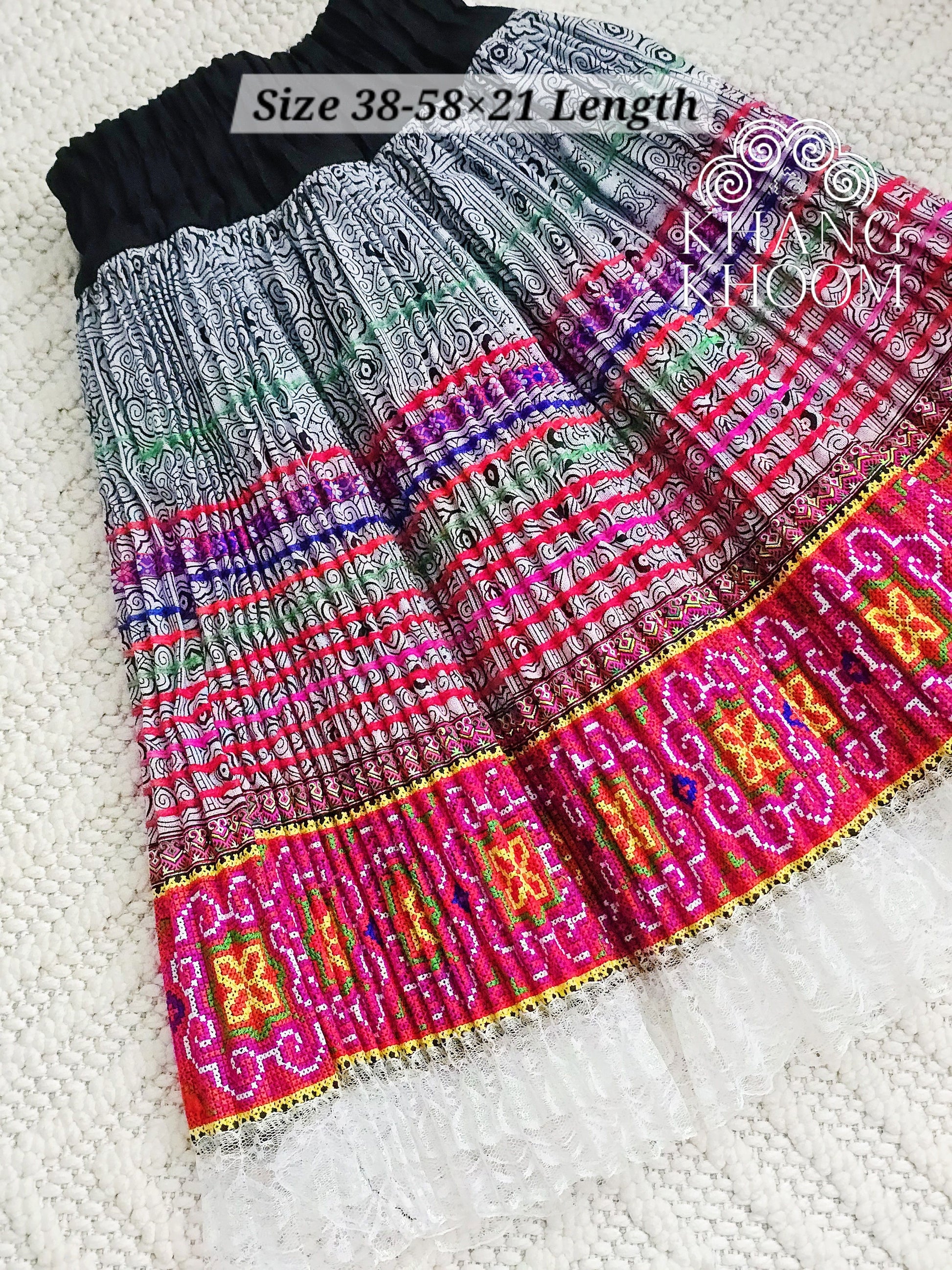 Step into timeless tradition with this beautiful Hmong Suav skirt. Crafted with vibrant printed Hmong patterns, the skirt is highlighted with machine embroidered detailing along the bottom trim, creating a striking and authentic look. The design is gracefully finished with a delicate white lace trim, adding softness and elegance to the bold cultural patterns.