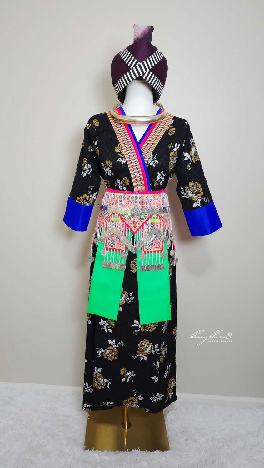 Hmong Xeev clothing set with handmade Hmong Leeg trim and laug (dab tsho)