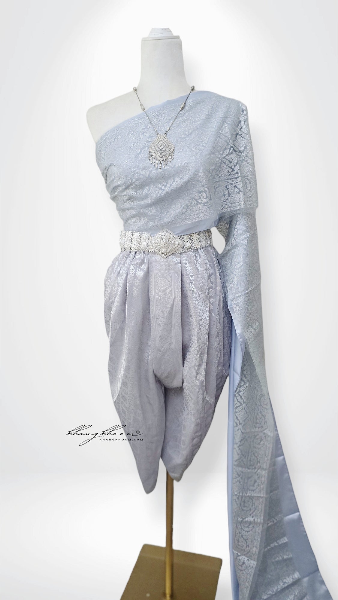 Pants are sewn with an elastic waistband and zipper closure in the front. Sabai are free size and worn wrapped around your chest and over the shoulder