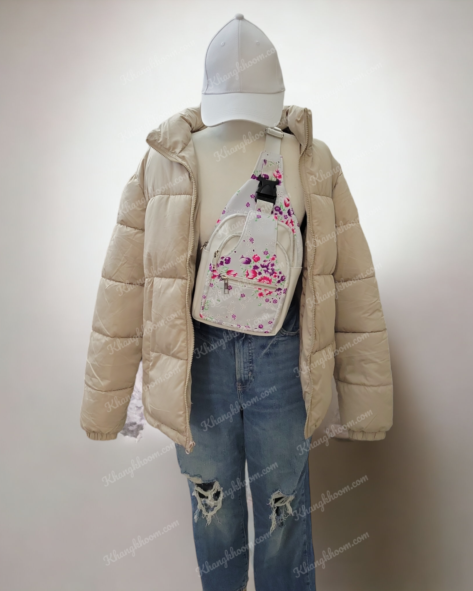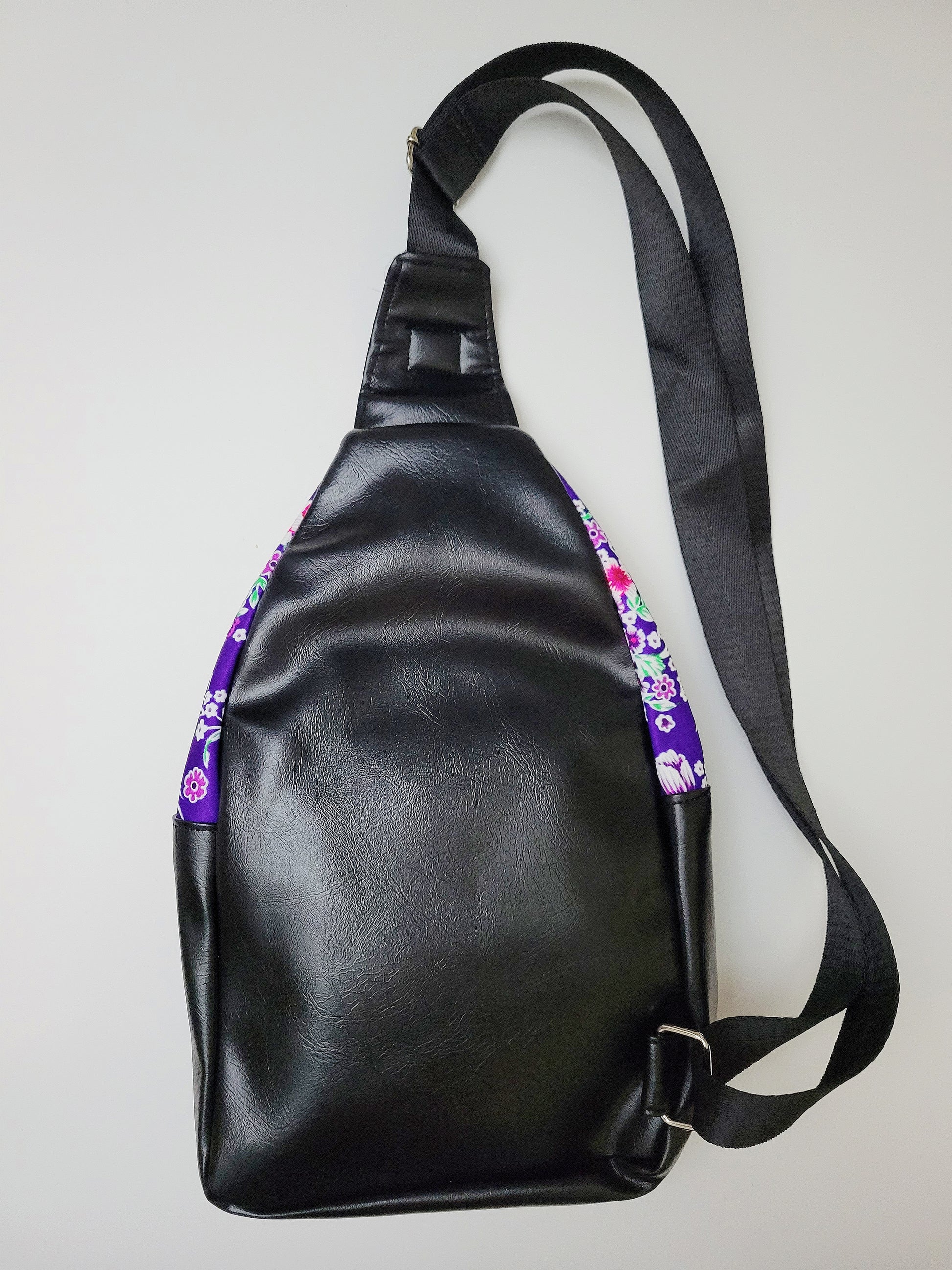Hmong ntaub li loos featuring an interior zipper pocket and 3 frontal pocket. Sling bag is made with faux leather and floral nylon fabric