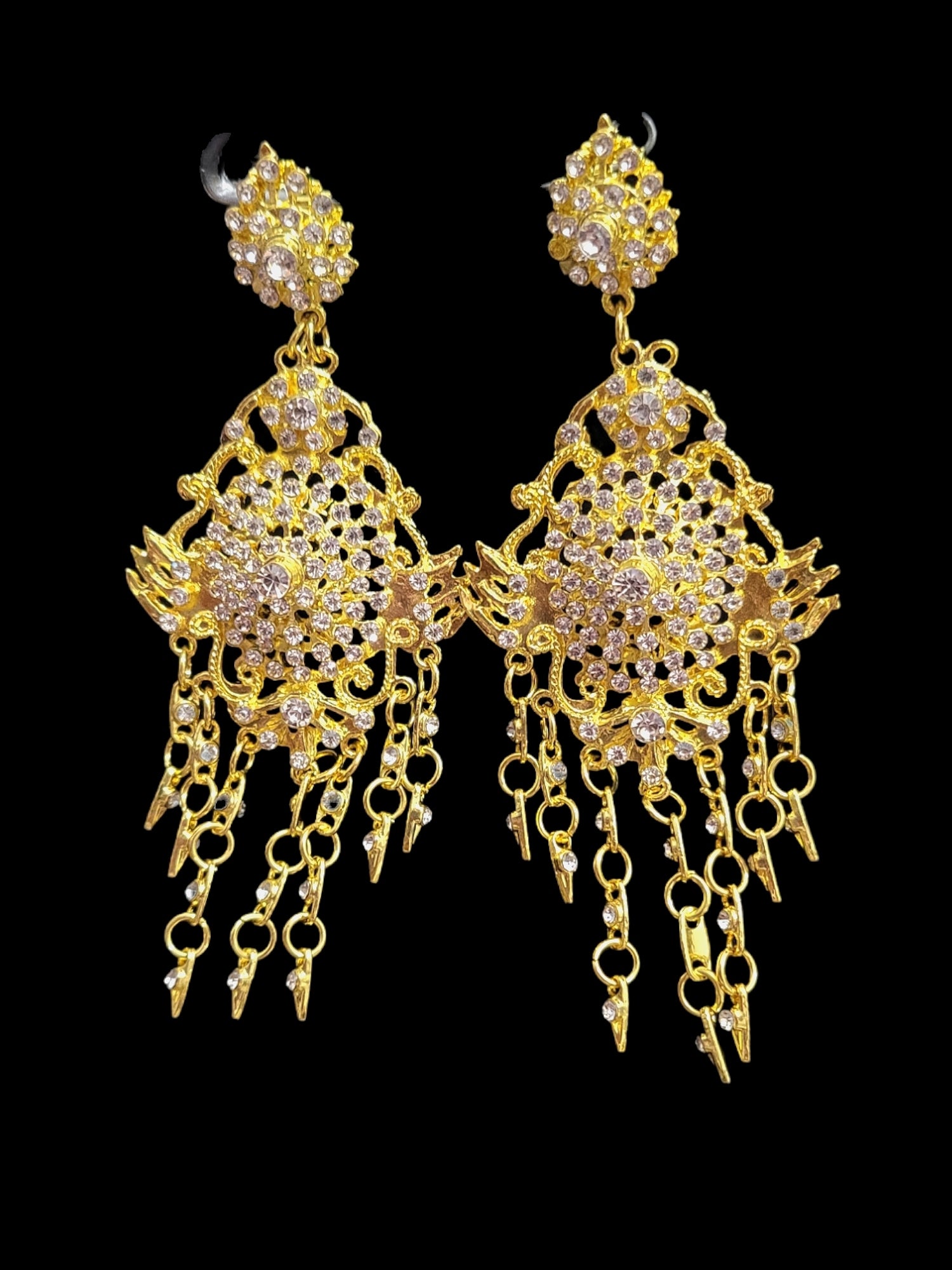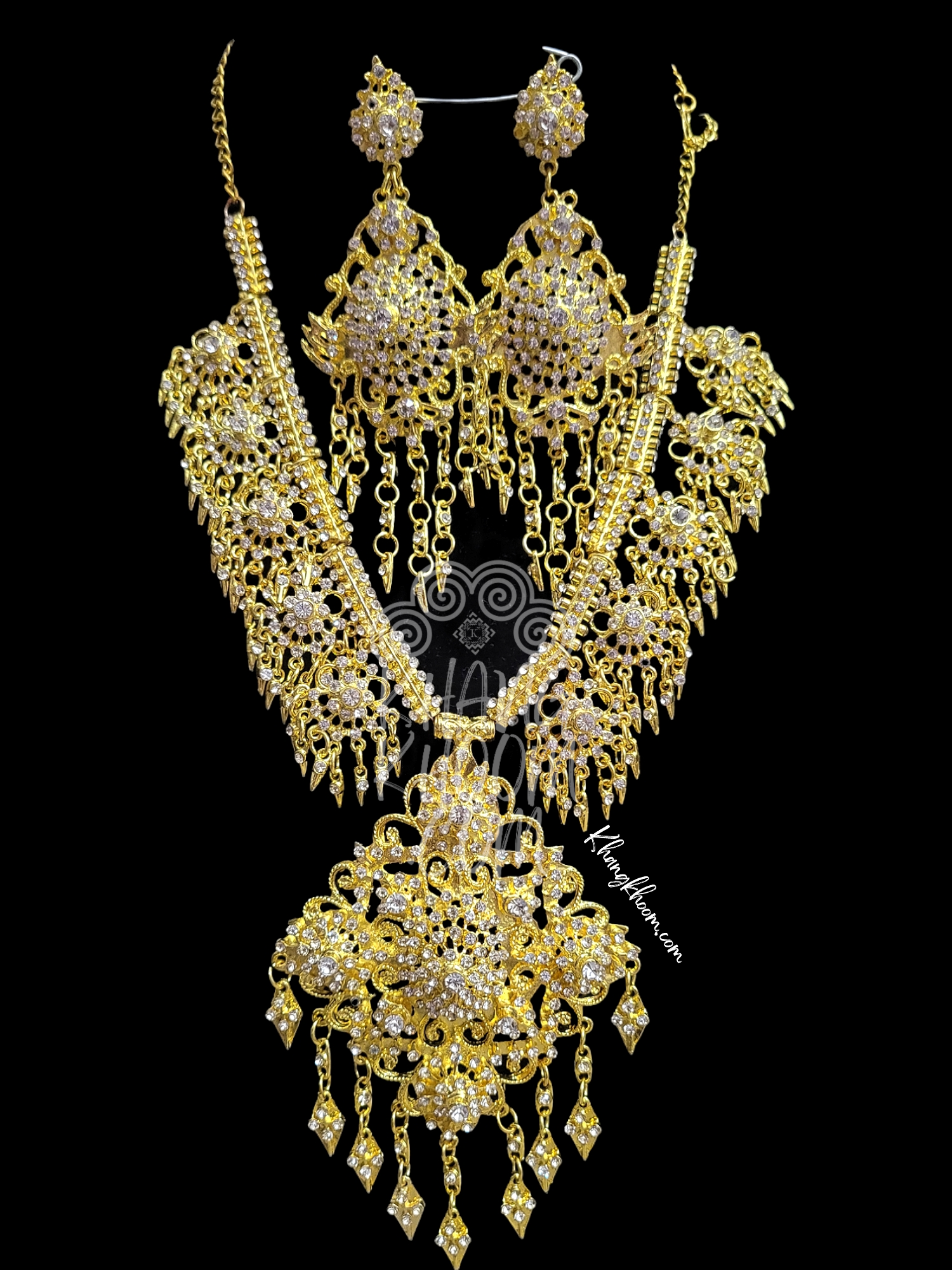 A set of gold necklace set featuring small rhinestone with chandelier details