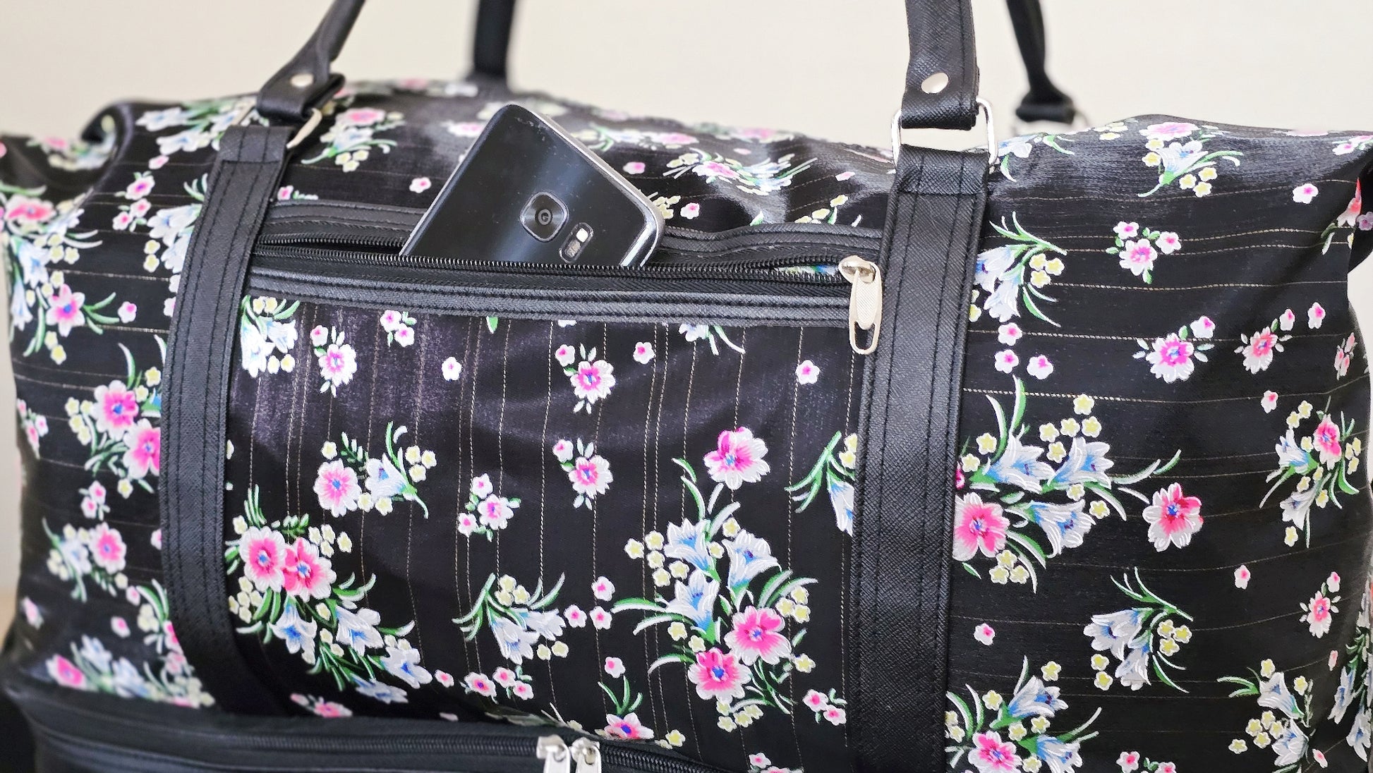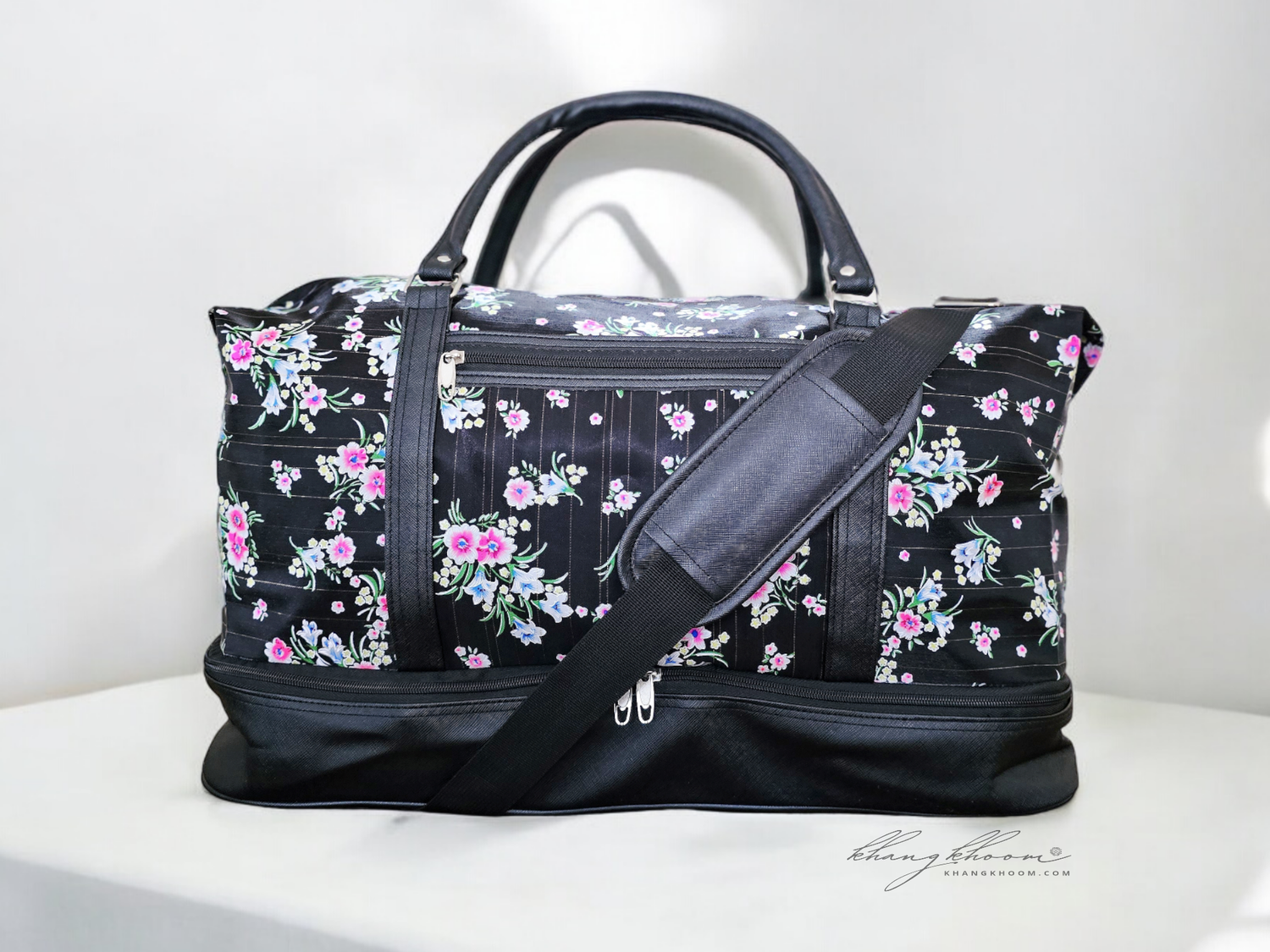 Travel duffle bag with faux leather handles & lining, adjustable padded strap, 2 side pockets and a rolling luggage sleeve sewn on hmong floral (unicorn) fabric. This travel bag has a zippered bottom compartment located under the main compartment. It can hold your shoes or dirty clothes and creates a separation from the main compartment.