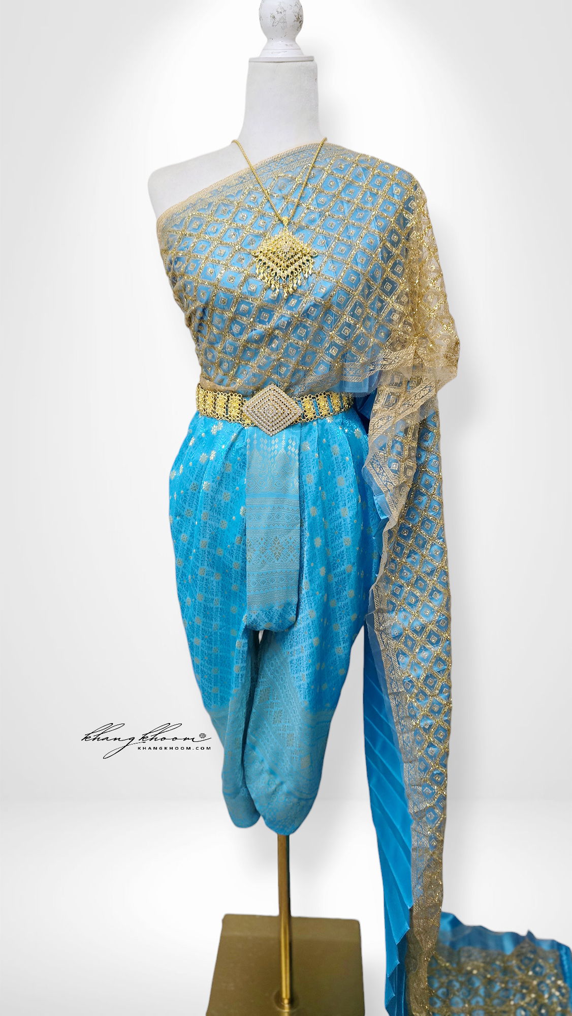Pants are sewn with an elastic waistband and zipper closure in the front. Sabai are free size and worn wrapped around your chest and over the shoulder
