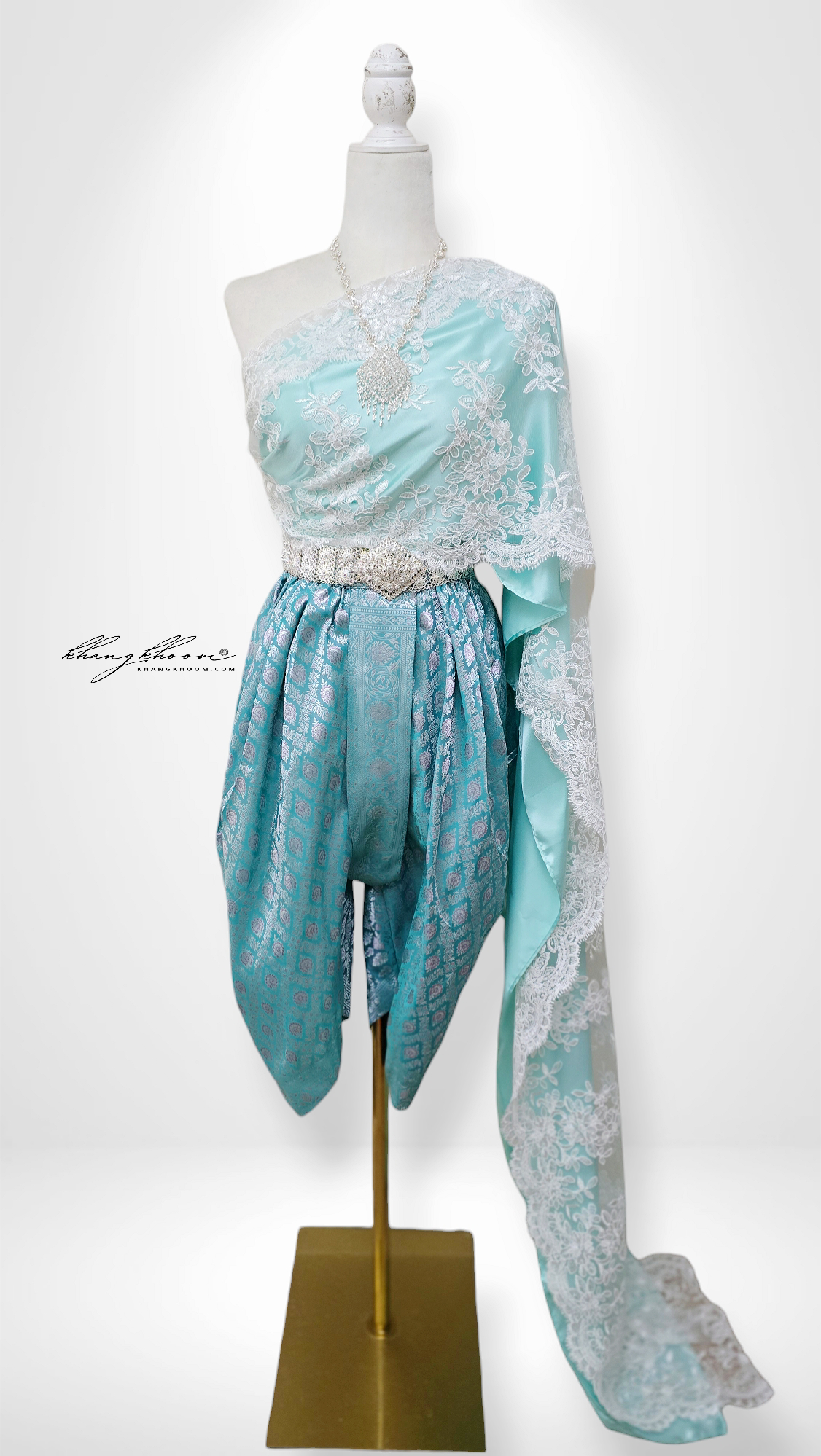 Pants are sewn with an elastic waistband and zipper closure in the front. Sabai are free size and worn wrapped around your chest and over the shoulder