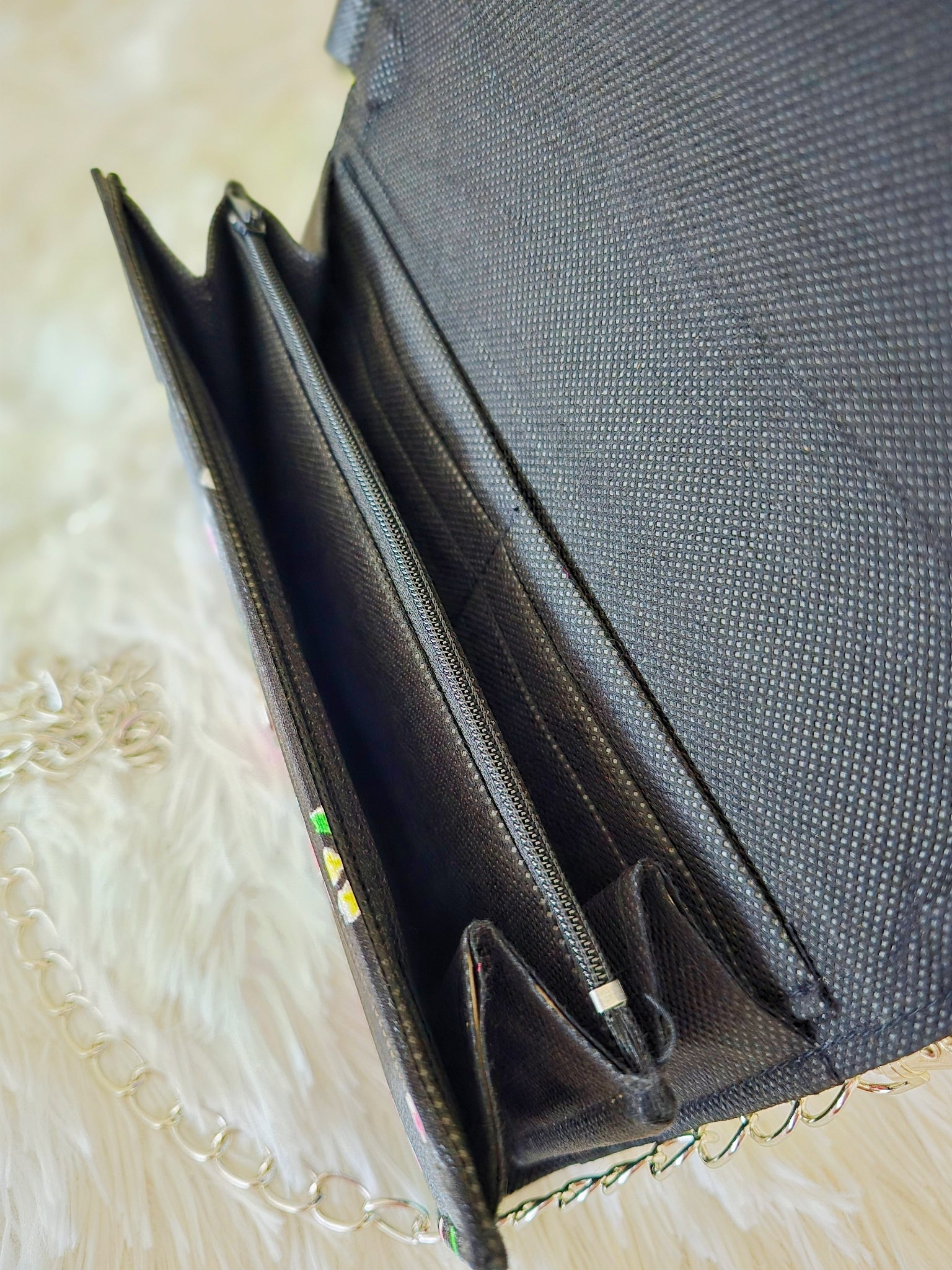 Unicorn envelope crossbody bag featuring an middle zipper pocket, card slots and side cash pocket